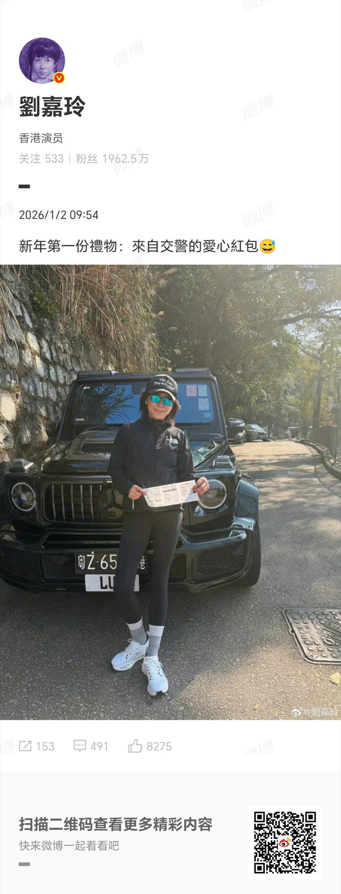 [#刘嘉玲晒罚单#]1月2日实盘配资网站论坛,@劉嘉玲晒照发文:新年第一份礼物:來自交警的爱心红包😅